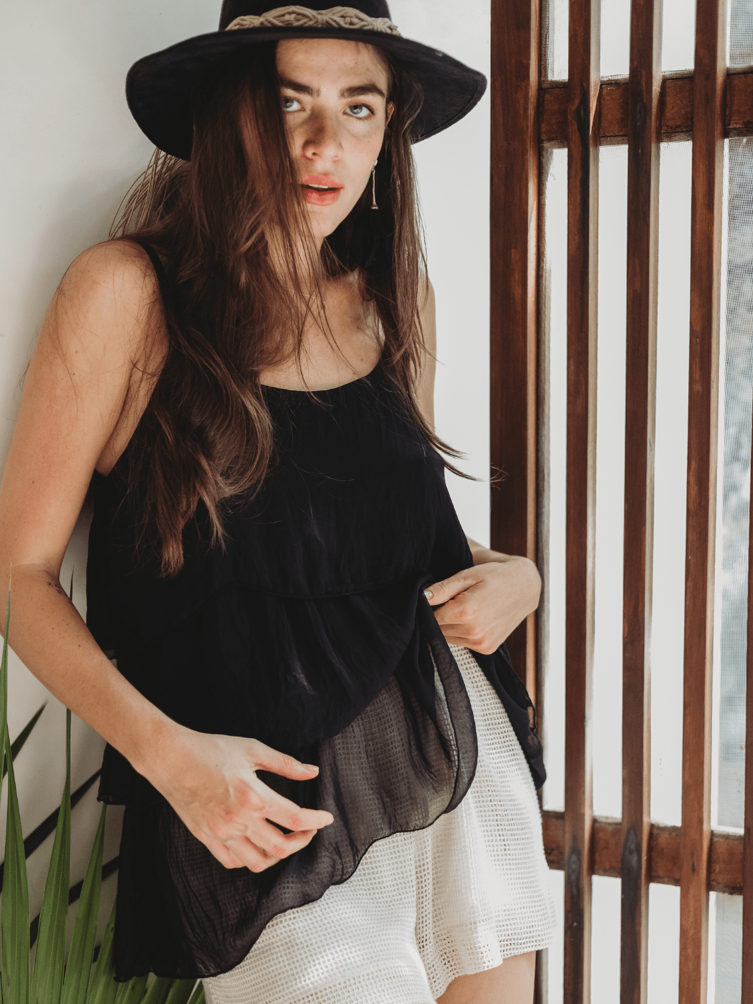 This sand-colored silk strappy top fits perfectly and is the perfect combination of freshness and versatility. It's easy to pair with any style, whether for a casual or more elegant look.