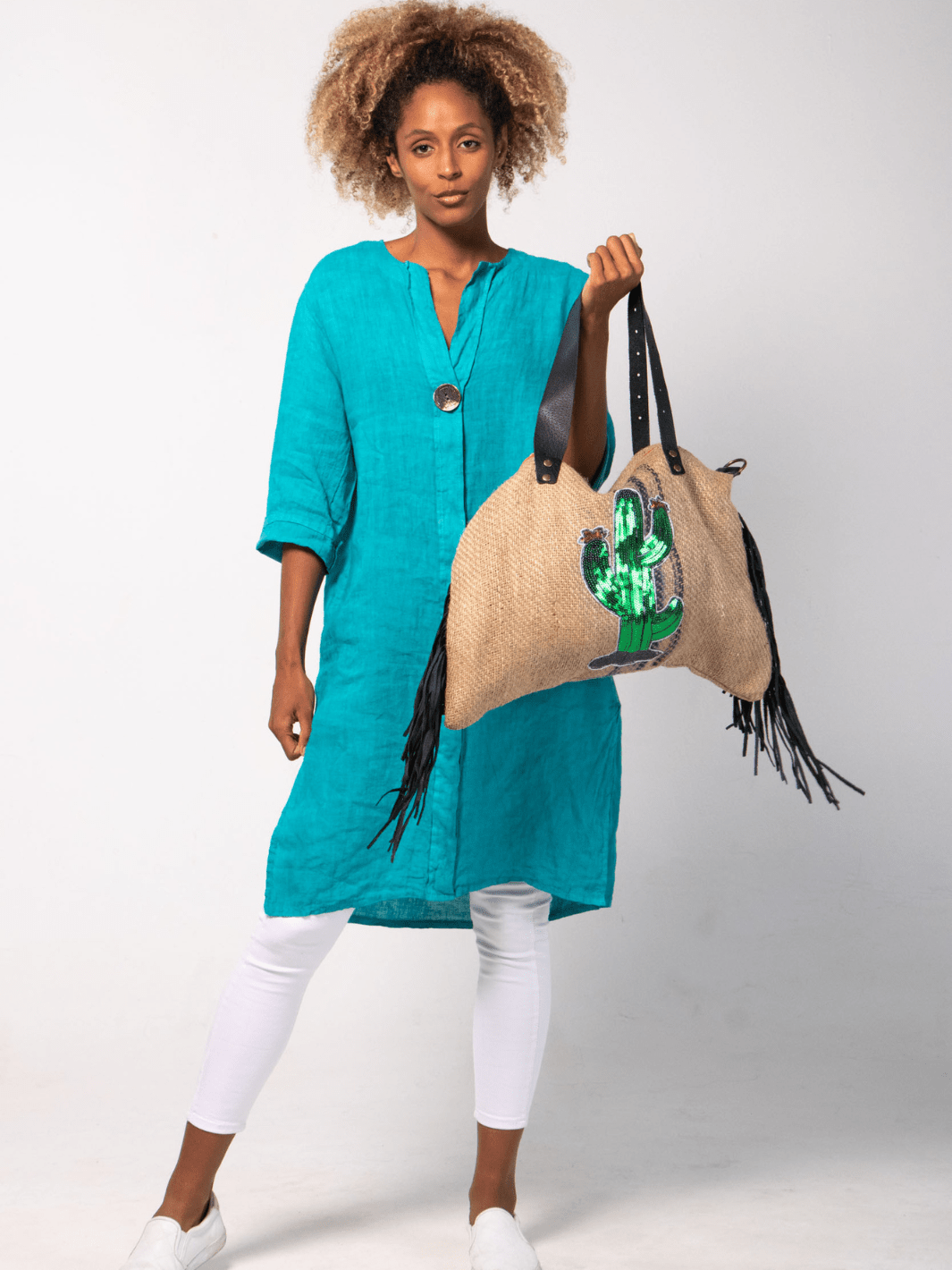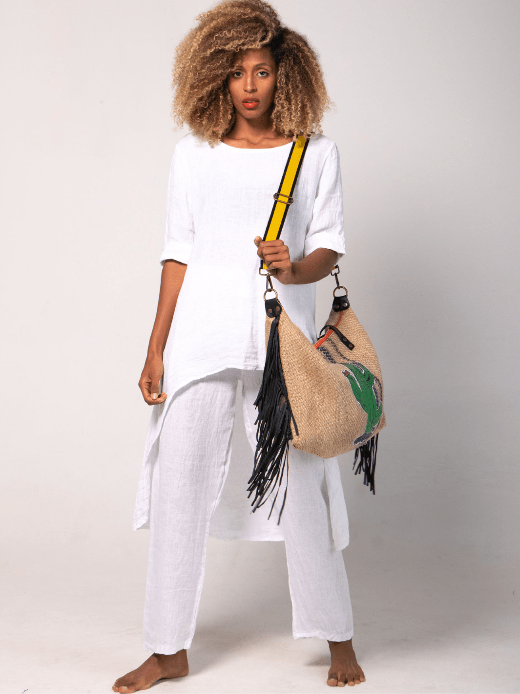 Beautiful custom-made cotton handbag with tassels and a beautiful leather strap. Spacious and elegant, what more could you ask for in a bag?
