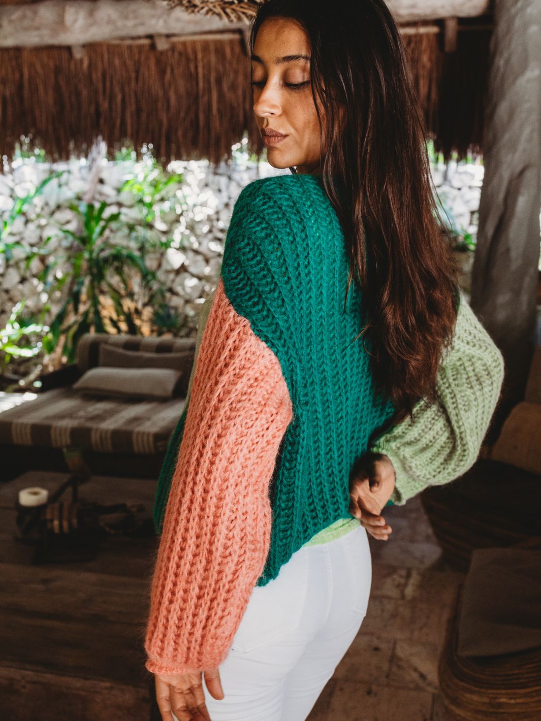 Este cardigan es increíblemente suave y cómodo, perfecto para los días frescos. La mezcla de colores es muy original, ¡me encanta!