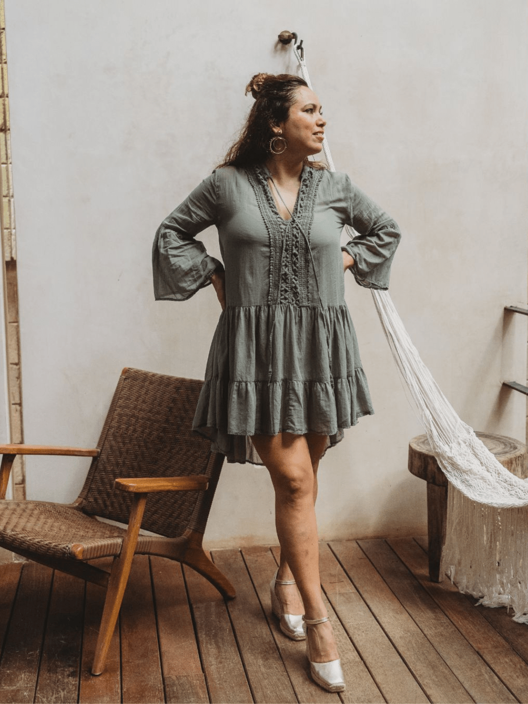 100% cotton dress perfectly combines boho chic style with everyday comfort. Its one-size-fits-all design is ideal for any body type, providing a soft and flattering drape that will make you feel free and stylish. It features a delicate V-neck, which subtly and femininely shapes the neckline, adding an elegant and sophisticated touch.