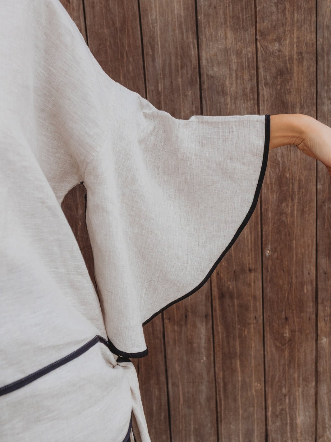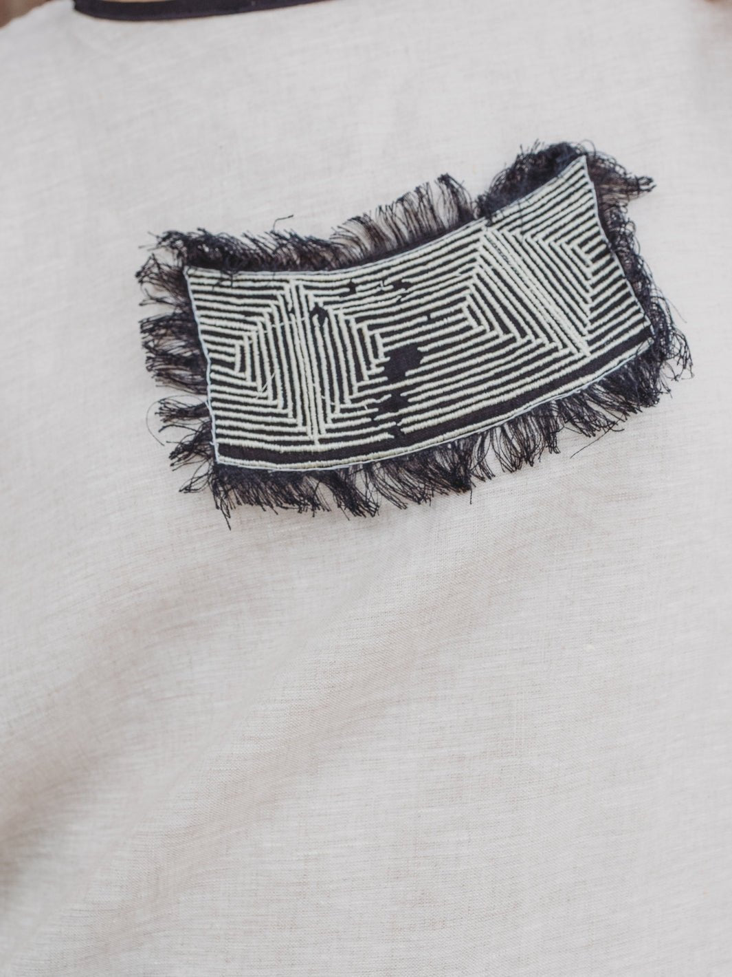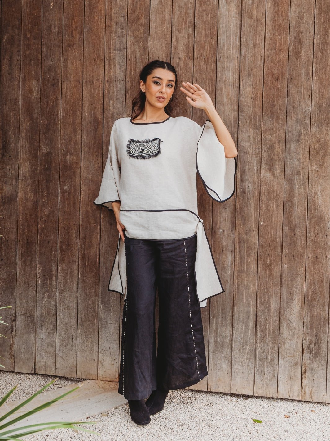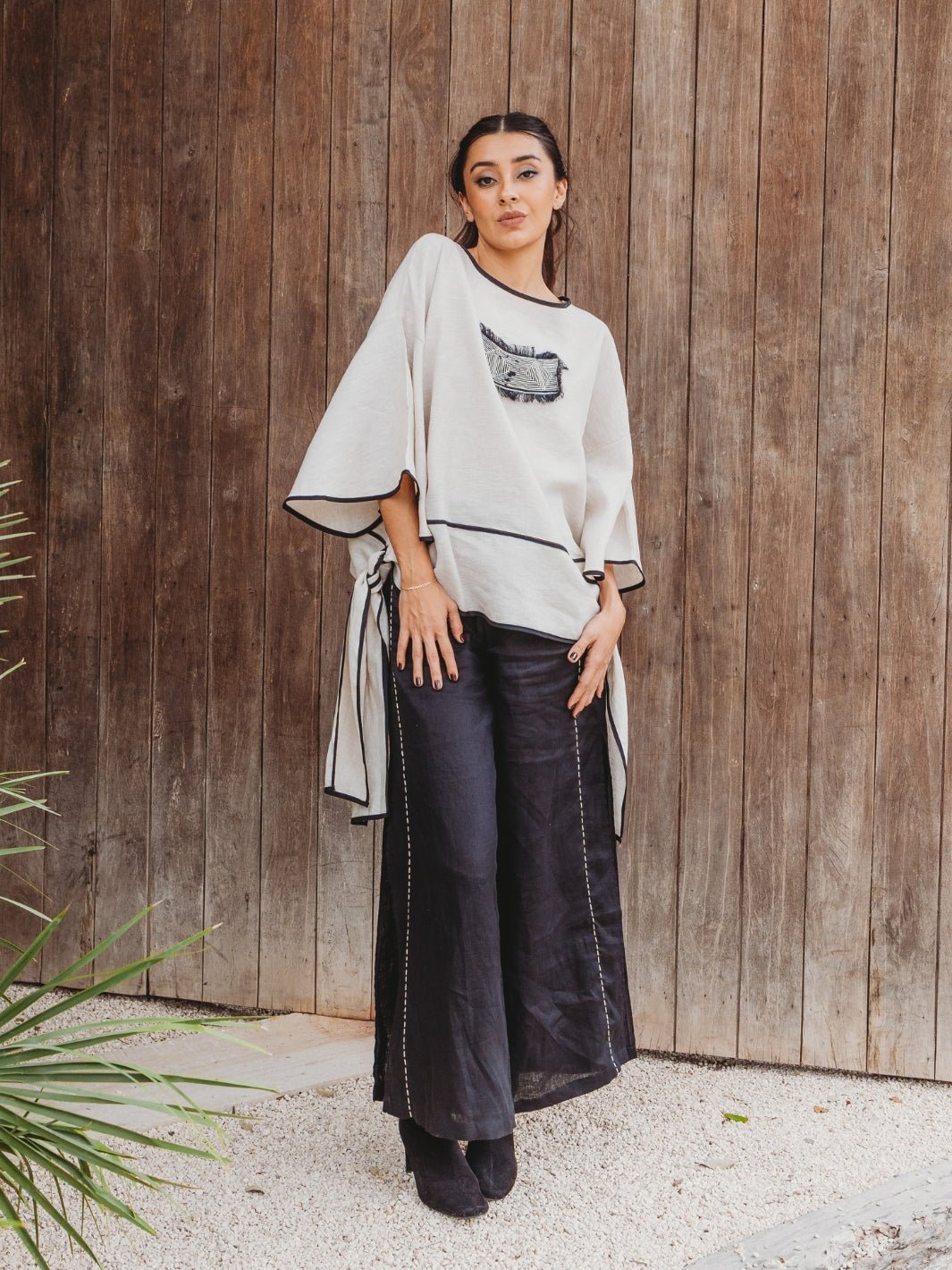 Hay blusas que simplemente funcionan. Esta es una de ellas. Holgada, sofisticada, con esas mangas acampanadas que fluyen como aire. El detalle bordado en el pecho mostrando elegancia.