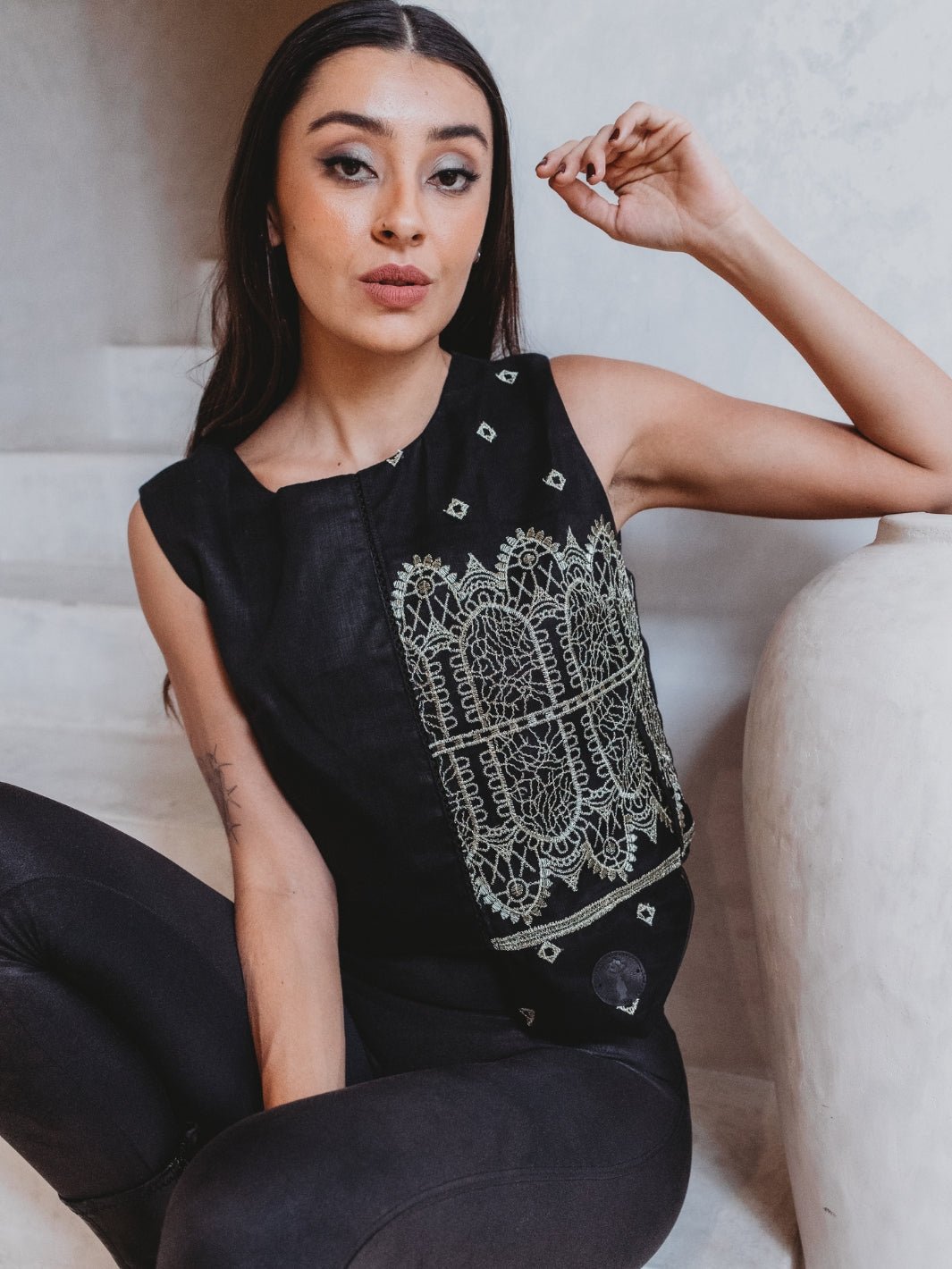 Con un corte cropped estructurado muy favorecedora y una cremallera en la espalda, esta blusa redefine lo clásico con un giro moderno y atrevido. El detalle bordado artesanal estilo balinés en el pecho añade un toque de sofisticación, mientras que los pequeños detalles en los hombros aportan un toque bohemio sin exceso. El cuello redondo permite movimiento libre sin sacrificar elegancia.