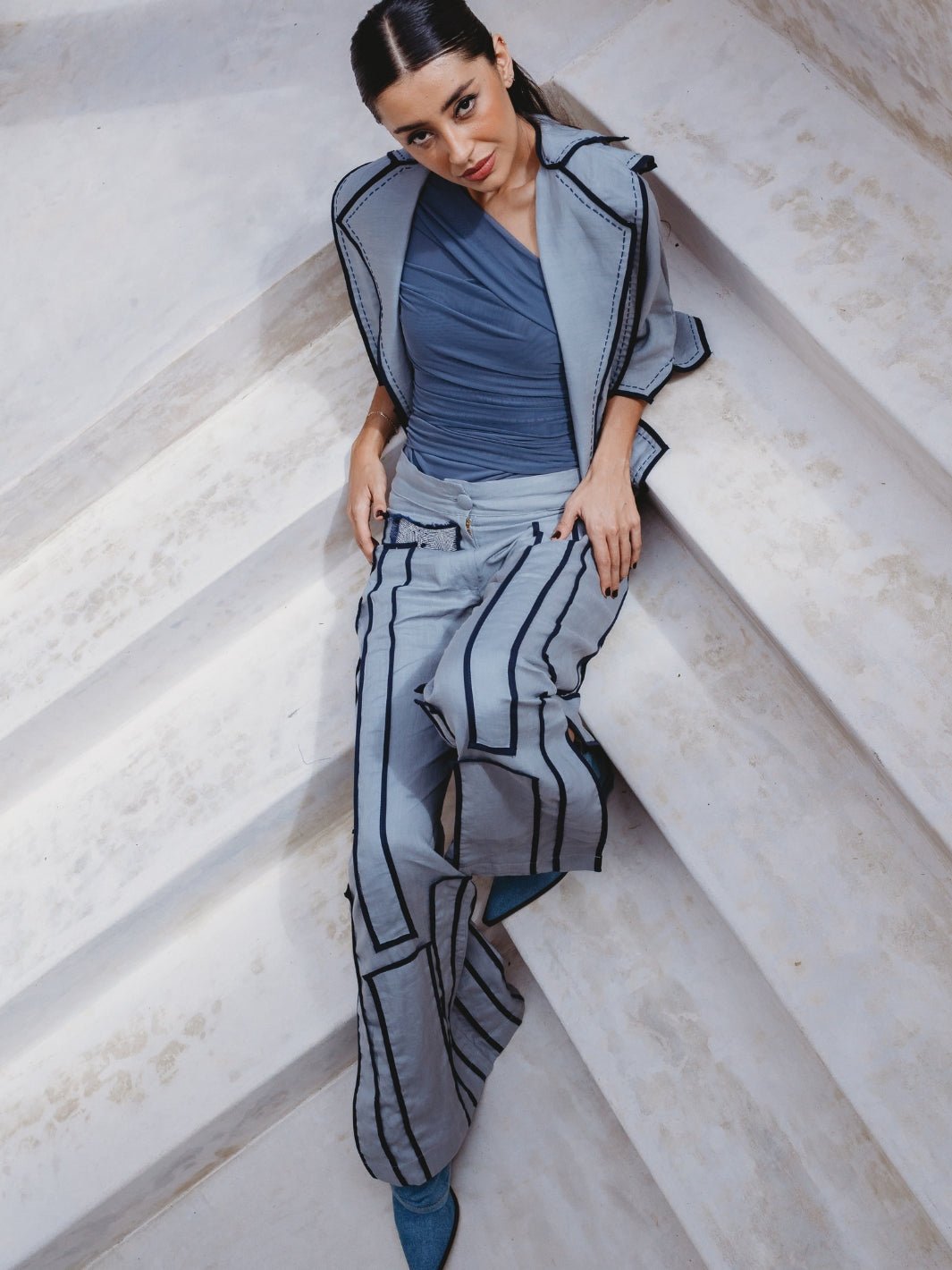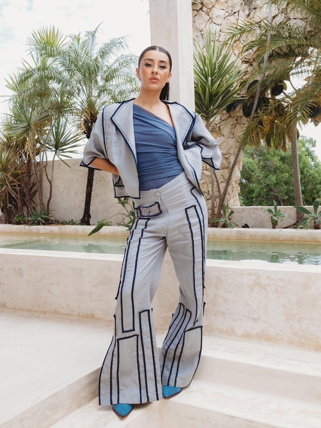 Con un diseño asimétrico único y patrón geométrico en contraste de colores, ésta chaqueta es súper coqueta y elegante. El lino es ligero y transpirable, perfecto para climas cálidos, permitiendo movimiento libre sin sacrificar sofisticación.
