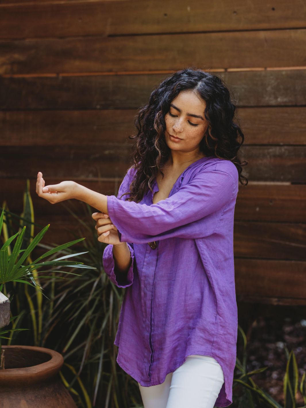 La blusa es preciosa, el escote te alarga el cuello y el botón le da mucha onda. La uso con todo, ¡es perfecta!